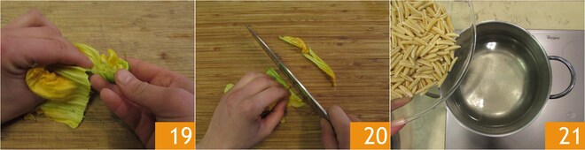 Limpe as flores de abóbora: com um pincel, remova quaisquer vestígios de terra, extraia o pistilo interno 19 e corte-as em tiras finas 20. Cozinhe os gnocchetti 21.