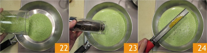 Despeje o creme de abobrinha na frigideira 22, adicione a pimenta 23 e a casca de limão 24.