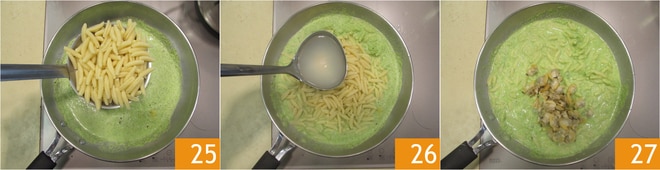 Assim que subirem à superfície, escorra os gnocchetti na frigideira 25, ajuste a consistência com mais um pouco da água de cozimento e finalize o cozimento 26. Desligue e adicione também as amêijoas 27.