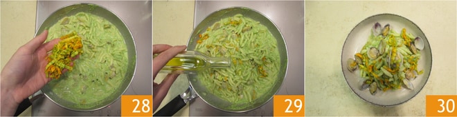 Finalize com as flores de abóbora cortadas em julienne 28, um fio de óleo 29 e emulsione salteando tudo. Sirva adicionando as amêijoas com casca reservadas. Os gnocchetti sardi com amêijoas e creme de abobrinha estão prontos para serem saboreados 30.