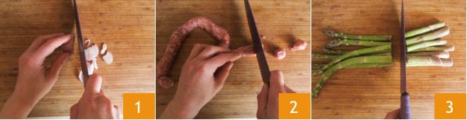 Para preparar os gnocchetti sardi com aspargos e linguiça, primeiro limpe a chalota e fatie-a finamente 1. Corte a linguiça em pedacinhos 2. Agora lave os aspargos e retire a parte lenhosa do talo 3.