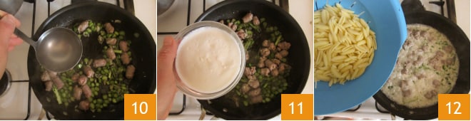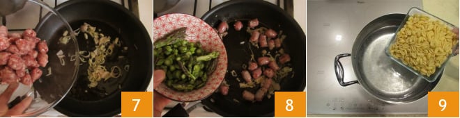 Adicione a linguiça e deixe dourar por alguns instantes 7, depois junte também os aspargos 8. Deixe cozinhar assim por cerca de 5 minutos e, enquanto isso, coloque no fogo uma panela cheia de água salgada que servirá para cozinhar os gnocchetti. Quando a água ferver, cozinhe a massa al dente 9.