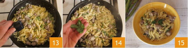 Adicione pimenta 13 e hortelã fresca 14 e sirva os gnocchetti sardi com linguiça e aspargos bem quentes 15.