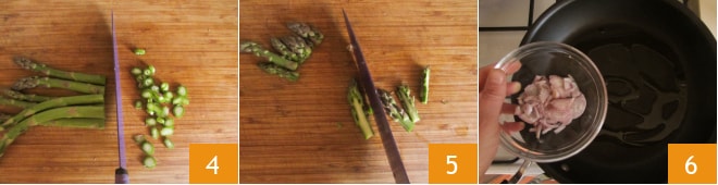 Corte o talo em rodelas 4 e as pontas ao meio 5. Em uma panela, aqueça o óleo, adicione a chalota fatiada 6 e deixe dourar em fogo moderado.