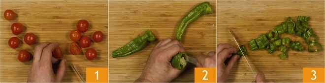 Para preparar os nhoques com pimentões friggitelli e linguiça, primeiro lave os tomatinhos e corte-os ao meio 1. Limpe os pimentões friggitelli removendo as sementes e os filamentos internos 2, depois corte-os em rodelas 3. Coloque uma panela de água no fogo para ferver e cozinhar os nhoques.