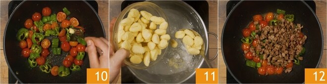 Cozinhe em fogo médio por 5 minutos, depois remova o alho 10 e reduza o fogo ao mínimo. Neste ponto, a água deve estar fervendo, então cozinhe os nhoques pelo tempo indicado na embalagem 11. Enquanto isso, adicione a linguiça dourada aos tomatinhos e pimentões friggitelli na frigideira 12.