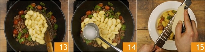 Após o tempo de cozimento, escorra os nhoques diretamente na frigideira 13 e salteie tudo por alguns segundos, misturando com uma concha da água de cozimento 14. Rale o provolone picante a gosto 15 e sirva seus nhoques com pimentões friggitelli e linguiça!