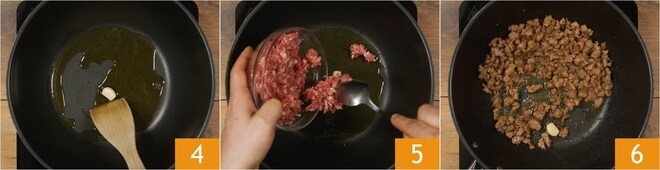 Em uma frigideira, aqueça o óleo com o dente de alho 4, depois adicione a linguiça 5 e deixe dourar em fogo alto por alguns minutos 6. Reserve a linguiça, cuidando para conservar o fundo de cozimento.