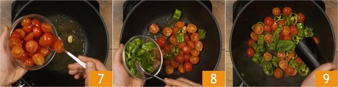 Na mesma frigideira, adicione os tomatinhos 7 e os pimentões friggitelli 8, perfume com as folhas de manjericão e ajuste o sal e a pimenta 9.
