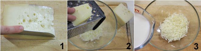 Para preparar os nhoques com creme de Asiago, comece preparando o creme: pegue o Asiago e retire a casca 1, rale-o 2 e coloque-o no leite para macerar por 20 minutos 3.