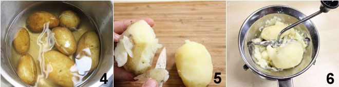 Enquanto isso, prepare os nhoques. Lave as batatas e coloque-as para cozinhar com a casca em uma panela de água salgada 4, quando estiverem cozidas, escorra-as e, ainda quentes, retire a casca 5. Amasse-as com a ajuda de um espremedor de batatas ou passe-vite e coloque-as em uma bacia grande 6,
