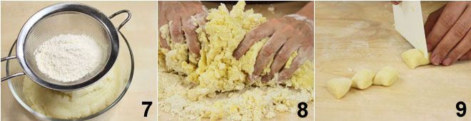 depois adicione a farinha peneirada e uma pitada de sal 7. Transfira a massa para uma superfície enfarinhada para trabalhá-la mais facilmente e amasse até obter uma mistura homogênea (se necessário, adicione mais farinha à mistura para facilitar o processo) 8. Neste ponto, deixe a massa descansar em temperatura ambiente por 10 minutos. Após o tempo necessário, divida-a em vários rolos e corte pedaços com espessura de 2-3 centímetros 9,
