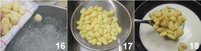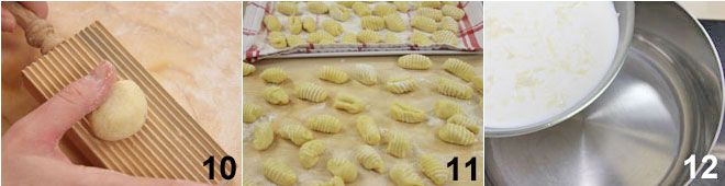 depois comece a formar seus nhoques com a ajuda de uma placa de nhoque 10, finalmente coloque-os em uma superfície ou bandeja enfarinhada antes de cozinhá-los 11. Neste ponto, pegue o Asiago com o leite e coloque em uma panela pequena, depois leve para ferver 12.
