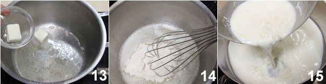 Enquanto isso, pegue uma panela pequena, derreta a manteiga 13 e incorpore a farinha com a ajuda de um batedor 14. Quando a mistura de Asiago e leite atingir o ponto de fervura, adicione à manteiga e continue mexendo, sempre utilizando o batedor, para misturar todos os ingredientes 15. Assim que o creme engrossar ou voltar a ferver, retire do fogo. Neste ponto, prove e, se necessário, ajuste o sal.