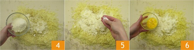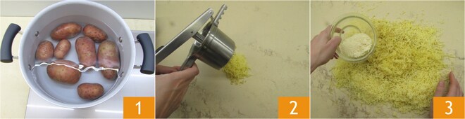 Para preparar os gnocchi da Val Varaita, primeiro cozinhe as batatas por 30-40 minutos, até que estejam macias, espete-as com um garfo para verificar o cozimento 1. Passe as batatas ainda quentes no espremedor 2, em seguida, espalhe-as sobre a superfície de trabalho. Adicione o Parmigiano Reggiano DOP 3.