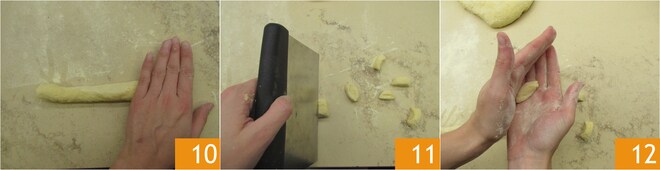 Faça rolinhos 10, depois pedaços de 1,5 cm 11 e dê a forma clássica das ravioles 12.