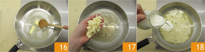 Agora prepare o molho: derreta a manteiga na panela 16 até que fique de cor âmbar. Adicione então o Raschera 17, mexa por cerca de trinta segundos, depois acrescente o creme de leite 18.