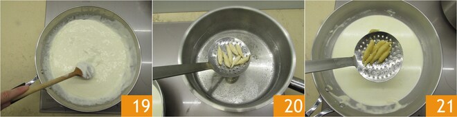 Cozinhe em fogo baixo até que o queijo esteja derretido 19. Em seguida, ferva os gnocchi em água salgada 20 e, assim que subirem à superfície, escorra-os diretamente no molho 21, deixando-os absorver o sabor por mais um minuto na panela.