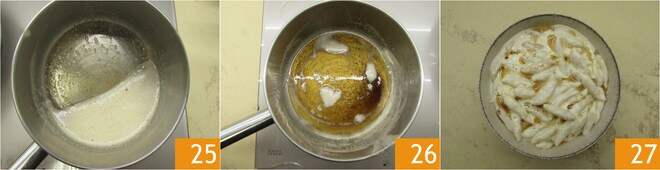 Adicione água do cozimento se necessário 22 e mexa 23. Enquanto isso, prepare a manteiga noisette: aqueça a manteiga em fogo baixo 24.