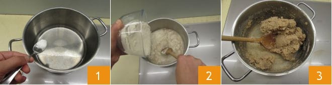 Para preparar os gnocchi de espelta com creme de Grana Padano, comece pela massa. Em uma panela, despeje a água, adicione o sal 1 e leve para ferver. Quando estiver fervendo, jogue a farinha de uma vez só e mexa imediatamente com uma colher de pau 2. Continue mexendo por 3 - 4 minutos até a massa ficar suficientemente seca e uma película se formar ao redor das paredes e no fundo da panela 3.