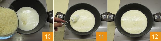 Dedique-se à preparação do creme de Grana Padano DOP: coloque o queijo ralado em uma panelinha junto com o creme de leite aquecendo suavemente 10. Mexa continuamente 11 até o queijo derreter 12.