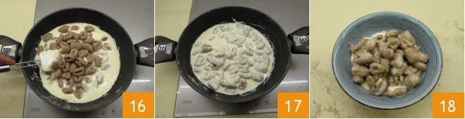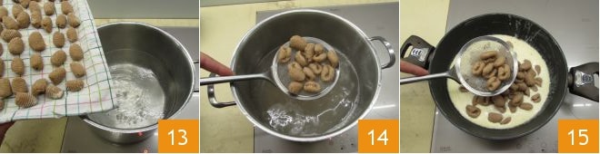 Enquanto prepara o creme, você também pode cozinhar os gnocchi. Mergulhe-os em uma panela com água fervente e salgada 13. Assim que subirem à superfície, escorra-os 14 e mergulhe-os no molho 15.