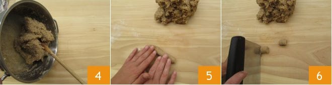 Transfira a massa para uma superfície de trabalho 4 e deixe esfriar apenas o tempo necessário para que não se queime. De fato, a massa deve ser trabalhada ainda quente. Retire uma porção de massa e faça rolinhos com os dedos 5. Depois, corte em pedaços de alguns centímetros usando uma espátula ou uma faca lisa 6.