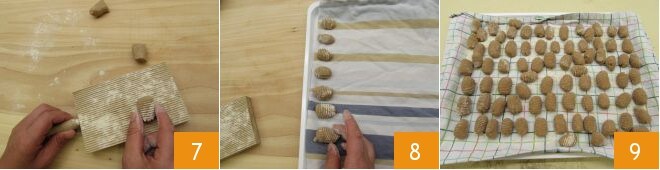 Polvilhe o rignocchi com um pouco de farinha integral e passe os pedaços para formar os gnocchetti riscados 7. À medida que os obtém, disponha-os sobre um pano de prato colocado sobre uma bandeja 8. Continue assim até acabar a massa e reserve-os temporariamente 9.