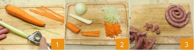 Para preparar os gnocchi sardi com ragu de linguiça, comece fazendo o refogado seguindo as instruções que você encontra na página Como fazer o refogado: elimine as extremidades da cenoura com uma faquinha e com um descascador, descasque a cenoura e lave-a sob água corrente. Lave o talo de aipo e remova a membrana filamentosa externa com o descascador 1. Por último, descasque a cebola e divida-a ao meio. Corte todos os vegetais em pequenos cubos 2. Retire a pele da linguiça, esfarele-a e reserve 3.