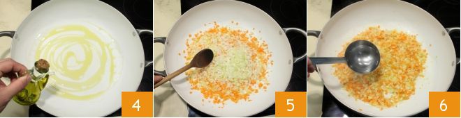 Coloque em uma frigideira o azeite de oliva extravirgem 4 e aqueça, depois adicione o picadinho de cebola, cenouras e aipo 5. Mexa para dourar os vegetais de todos os lados. Após 5 minutos, refresque com caldo (ou água fervente) 6 e deixe cozinhar por mais 10 minutos.