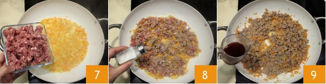 Adicione a linguiça 7, salgue 8 e refresque com vinho tinto 9.