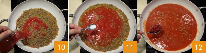 Despeje o molho de tomate 10, adicione uma pitada de açúcar para suavizar a acidez do tomate 11. Adicione uma colher de sopa de extrato de tomate 12,