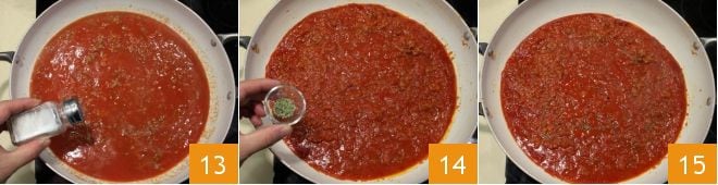 sal 13, pimente e aromatize com uma colher de chá de orégano 14, misture o ragu e continue cozinhando em fogo baixo 15 até que o molho esteja engrossado, mexendo de vez em quando com uma concha: levará cerca de 2 horas. Enquanto isso, coloque uma panela grande com água salgada para esquentar, perto do final do cozimento do ragu,