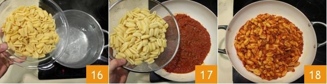 despeje os gnocchi na panela com água fervente 16 e cozinhe por cerca de 10 minutos ou pelo tempo indicado na embalagem. Ao final do cozimento, escorra a massa e despeje na frigideira contendo o ragu preparado 17: salteie tudo rapidamente e depois sirva os seus gnocchi sardi ao ragu de linguiça bem quentes à mesa 18.