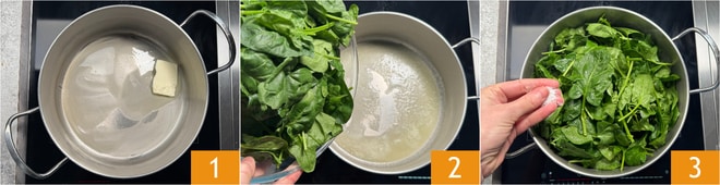 Para preparar o nhoque verde à romana, primeiro derreta a manteiga em uma panela grande 1, depois adicione o espinafre, limpo e lavado 2, e o sal 3.