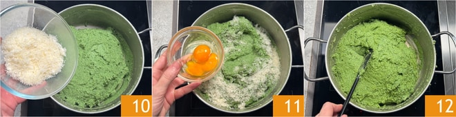 Com o fogo desligado, adicione o queijo ralado 10 e a gema 11, depois misture bem tudo com uma espátula 12.