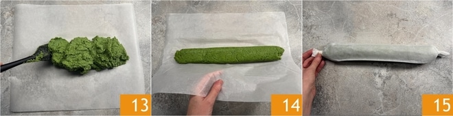 Coloque metade da massa no centro de uma folha de papel manteiga 13, depois modele para obter um cilindro com cerca de 3 cm de diâmetro 14. Enrole o cilindro no papel manteiga, torça as extremidades para selá-lo 15 e deixe esfriar completamente; levará cerca de 15-20 minutos, como alternativa, você pode deixá-los na geladeira durante a noite. Proceda da mesma forma com a metade restante da massa.