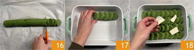 Após o tempo de resfriamento, unte uma faca de lâmina lisa e corte o cilindro em discos com espessura de 1-1,5 cm 16. Coloque os discos em uma assadeira untada de 18x25 cm, formando várias fileiras e sobrepondo-os levemente 17. Polvilhe a superfície com pedacinhos de manteiga 18.