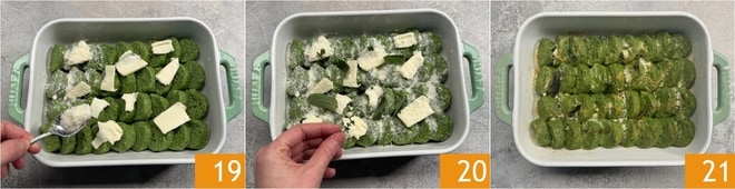 Finalmente, polvilhe com o queijo ralado 19, perfume com algumas folhas de tomilho e sálvia 20 e apimente. Cozinhe em forno estático pré-aquecido a 200° por cerca de 20 minutos, depois mude para o modo grill por 2-3 minutos. Quando tiverem formado uma bela crosta, retire o nhoque verde à romana do forno e sirva imediatamente 21!