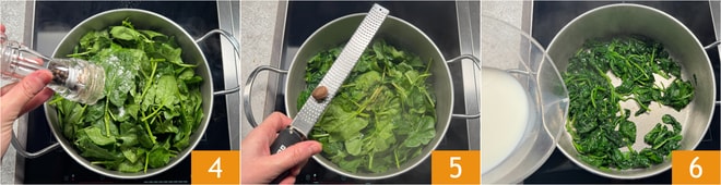 Tempere com pimenta 4 e noz-moscada 5 e deixe murchar por um minuto em fogo médio. Quando o espinafre estiver murcho, adicione o leite 6.
