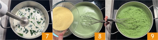 Desligue o fogo e bata com um mixer de imersão 7, depois leve a mistura quase à fervura. Neste ponto, adicione a semolina aos poucos, mexendo com um batedor 8 e deixe engrossar no fogo por 1-2 minutos, mexendo continuamente 9.