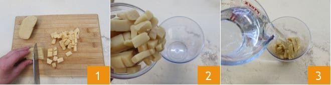 Para preparar a granita de amêndoa, comece cortando a pasta de amêndoa em pequenos cubos de tamanho igual 1. Coloque-os em um recipiente de bordas altas 2 e adicione a água 3.