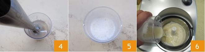 Bata os ingredientes usando um mixer de imersão 4 até obter um creme 5. Despeje a mistura na sorveteira (siga as instruções da sua sorveteira: para a que usamos não é necessário resfriar a tigela no refrigerador) 6.