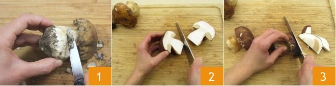 Para preparar os grãos de farinha de leguminosas com cogumelos e espinafre, primeiro faça o caldo de vegetais seguindo as instruções da nossa receita, depois passe para a limpeza dos porcini: raspe as impurezas com uma faquinha 1 usando também um pano úmido, se necessário, depois divida os cogumelos ao meio 2 e corte-os em fatias não muito finas 3.