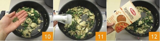 Tempere tudo com tomilho 10, sal 11 e pimenta, depois despeje os grãos de farinha de leguminosas 12,