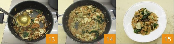 cubra com o caldo 13 e cozinhe, adicionando mais caldo conforme necessário. Quando atingir o efeito cremoso 14, desligue o fogo, adicione mais uma pitada de pimenta e sirva os seus grãos de farinha de leguminosas com cogumelos e espinafre bem quentes 15!
