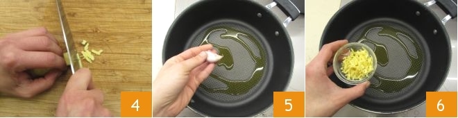 Descasque o gengibre e corte-o em palitos finíssimos 4. Aqueça o óleo em uma panela grande e refogue brevemente o dente de alho com casca 5, depois adicione também o gengibre 6 e refogue por mais alguns minutos.