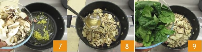 Neste ponto, adicione os porcini 7, mexa e cozinhe em fogo médio por alguns instantes adicionando uma concha de caldo 8, depois adicione também o espinafre 9 e deixe murchar por alguns minutos.