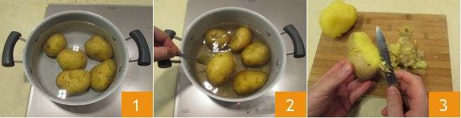 Para preparar o gateau de batatas com salame, comece cozinhando as batatas: lave-as e coloque-as em uma panela grande cobrindo com bastante água fria 1. Coloque a panela no fogo e, assim que a água começar a ferver, conte cerca de 30-40 minutos, dependendo do tamanho das batatas. Faça o teste do garfo para garantir que estejam realmente cozidas 2: se os dentes do garfo penetrarem facilmente no centro dos tubérculos, então estão prontas. Escorra as batatas e comece a descascá-las enquanto ainda estão quentes, ajudando-se com uma faquinha para não se queimar 3.