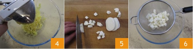 Por fim, amasse-as imediatamente em uma tigela: as batatas quando estão quentes se desfazem mais facilmente e não formarão grumos 4. Enquanto isso, corte a mussarela em cubos 5 e coloque-a em uma peneira para espremer, dessa forma você eliminará o soro em excesso 6. Como alternativa, você pode espremer usando um pano de prato limpo.